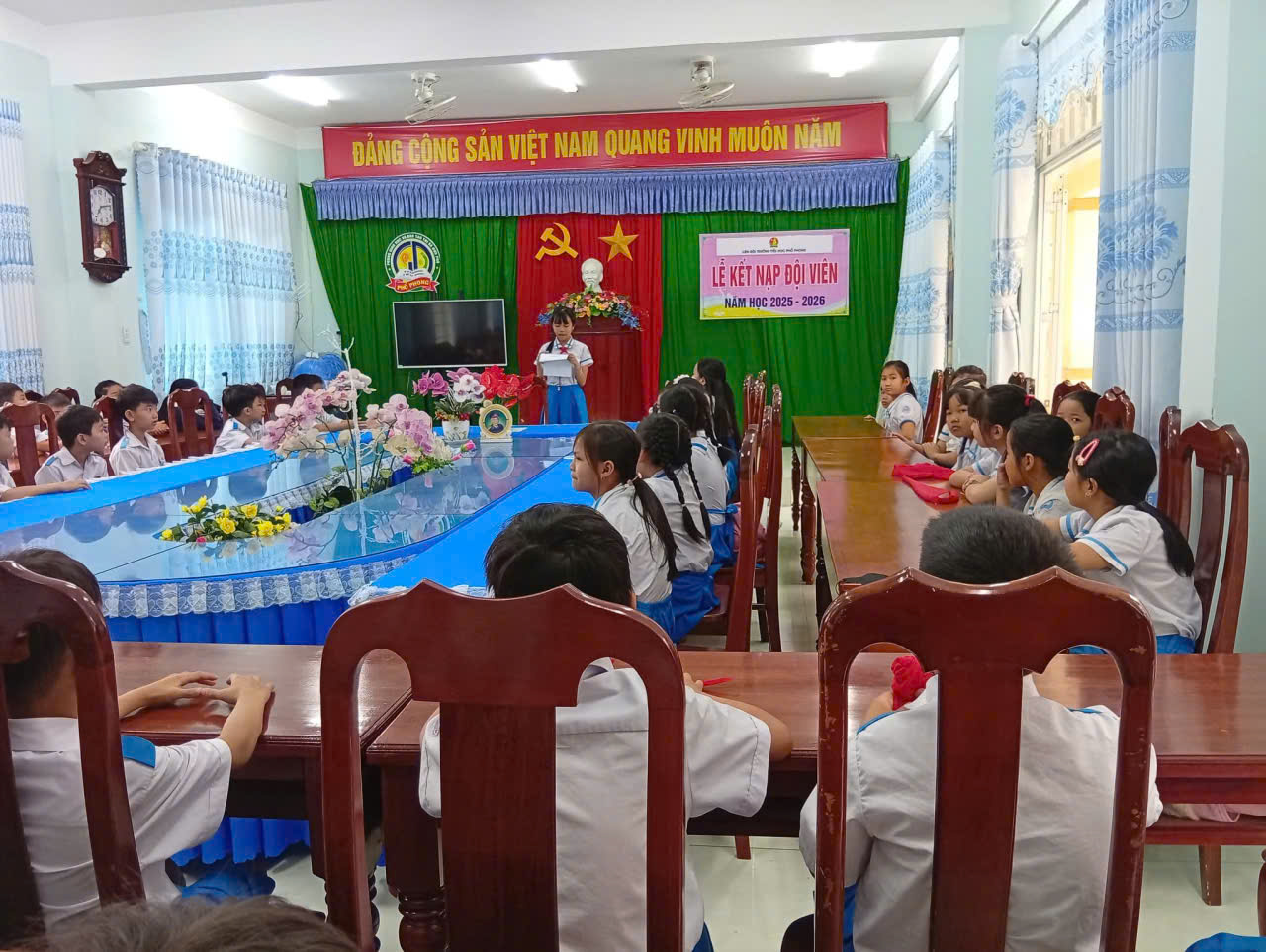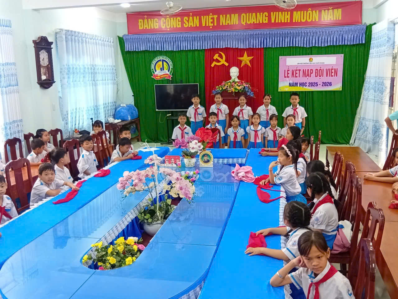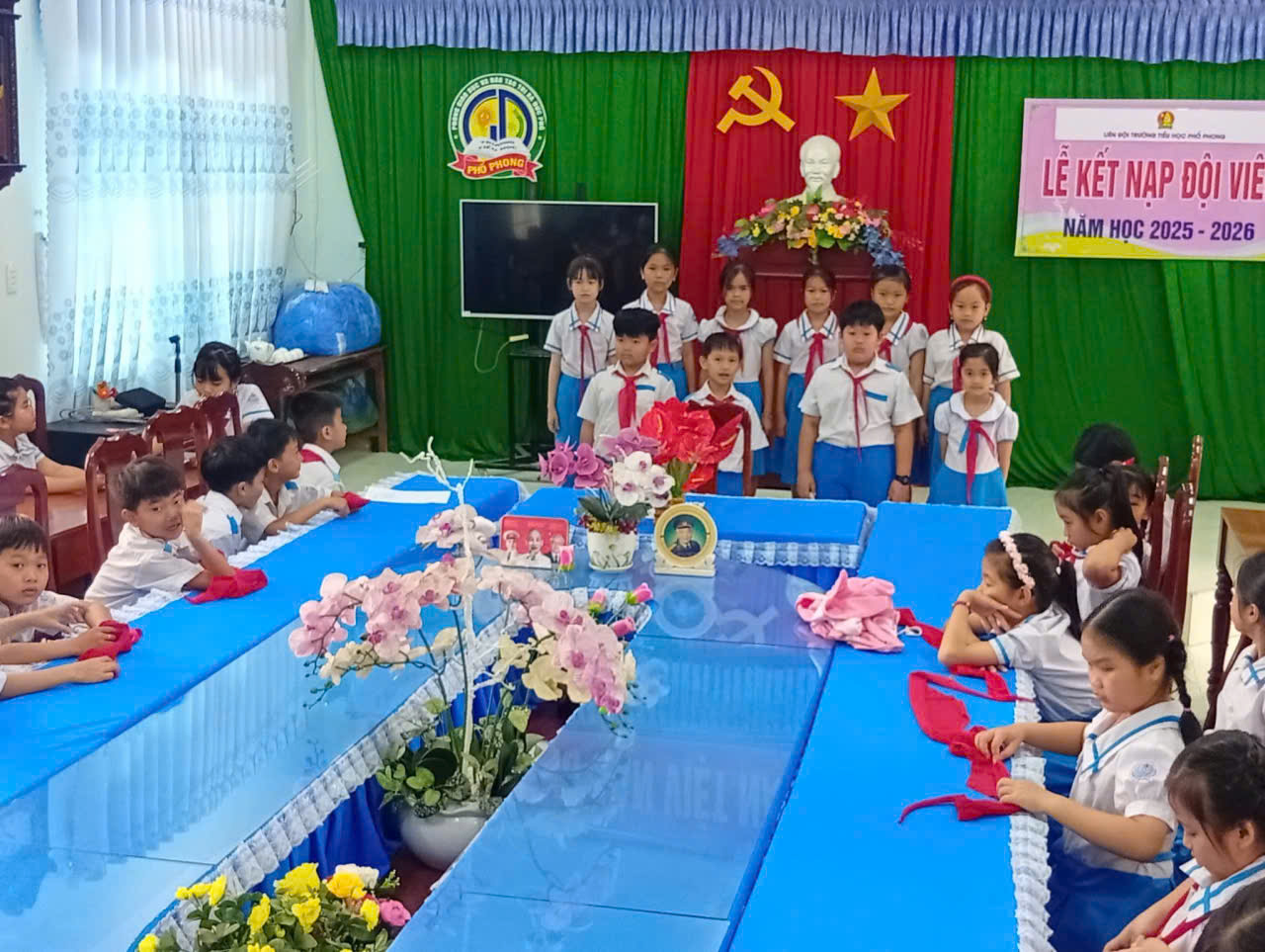 📖Trong buổi lễ trang nghiêm, các em học sinh đã được ôn lại truyền thống vẻ vang của Đội, lắng nghe ý nghĩa của chiếc khăn quàng đỏ – biểu tượng thiêng liêng của tuổi thơ Việt Nam. Giây phút được đeo khăn quàng đỏ trên vai đã trở thành dấu mốc đáng nhớ, đánh dấu sự trưởng thành và niềm vinh dự lớn lao của mỗi đội viên mới.