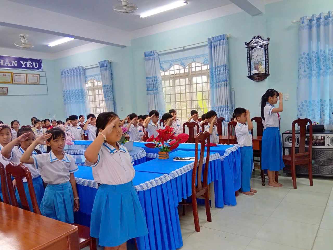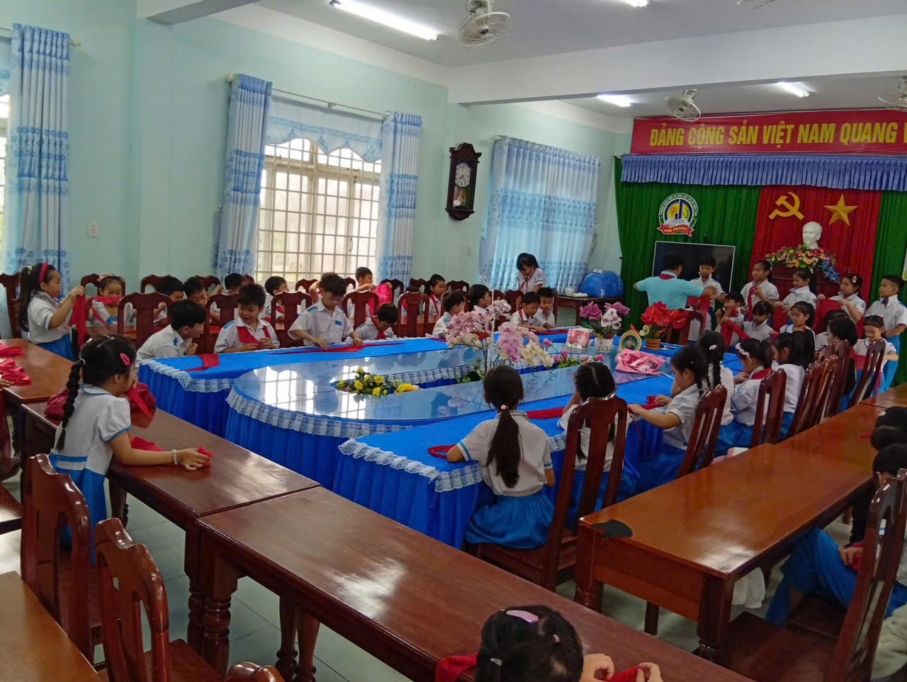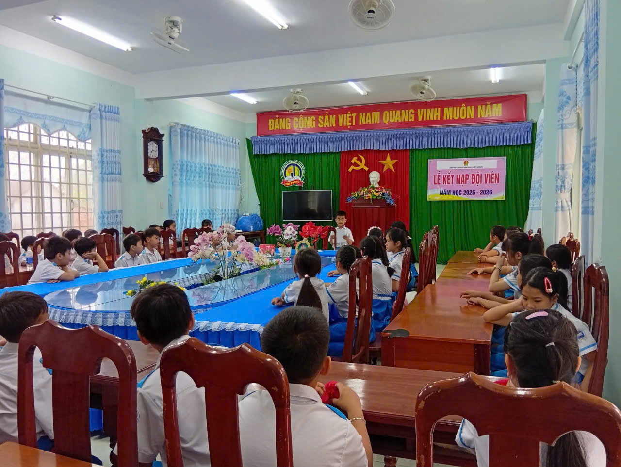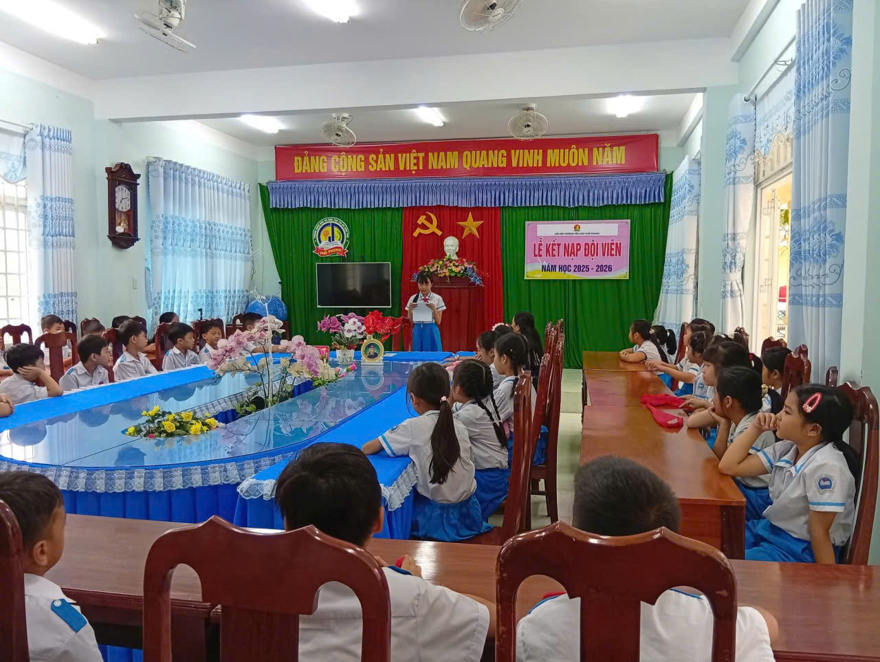 📖Trong buổi lễ trang nghiêm, các em học sinh đã được ôn lại truyền thống vẻ vang của Đội, lắng nghe ý nghĩa của chiếc khăn quàng đỏ – biểu tượng thiêng liêng của tuổi thơ Việt Nam. Giây phút được đeo khăn quàng đỏ trên vai đã trở thành dấu mốc đáng nhớ, đánh dấu sự trưởng thành và niềm vinh dự lớn lao của mỗi đội viên mới.